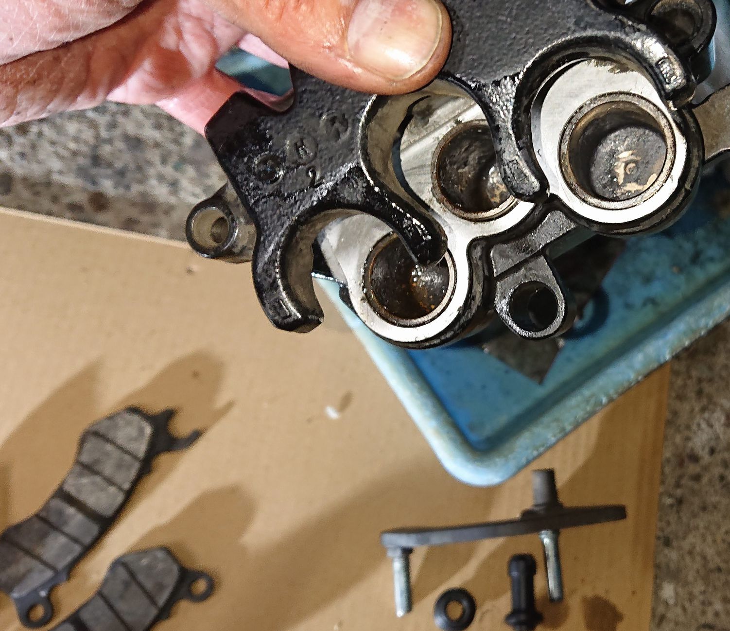 ブレーキ握ってみます、下のピストンのみ出てきます、こいつかな!シールパッキン用意してないけど分解挑戦です、下のピストンに咬ませ物してブレーキにぎにぎして上のピストンだけ抜きました、ポロンと取れましたよそんなに表面傷んでなさそうですが、ウエスで拭いてからピカールで磨きます、くすんだ色がこんなに!