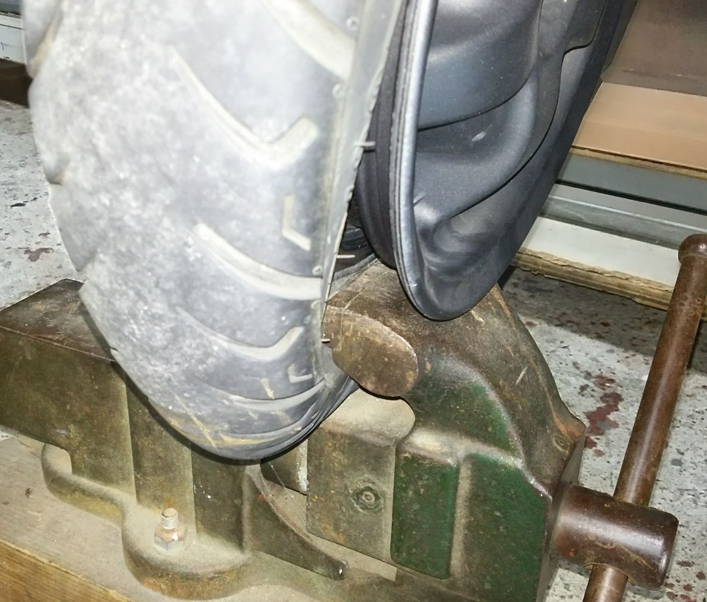 つるっぱげのチェンシン製硬すぎノーマルタイヤを外します、踏みつけますが全然ビートが落ちません、そこで大きい万力で挟みました、
