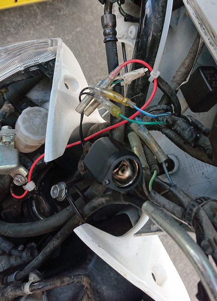 リード125定番のグリップヒーター用純正電源から12Vを引っ張りました、一口ソケットを利用