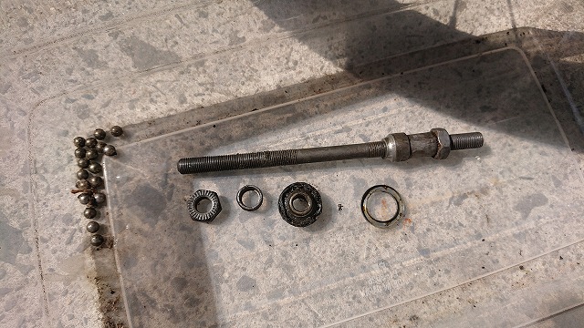 ベアリングは片側9個です、球やテーパー部は多少傷んでいますが使えそうと判断(シャフト少し曲がってる?)