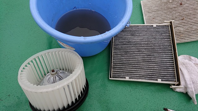 排水です、少し砂汚れが出てきた位でした、ダクト内部周辺はタオルで吹き上げます、黒っ。