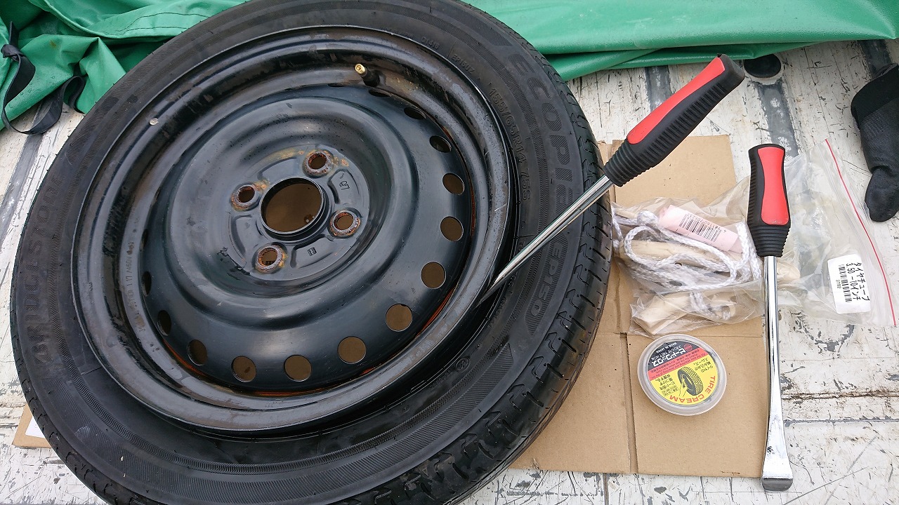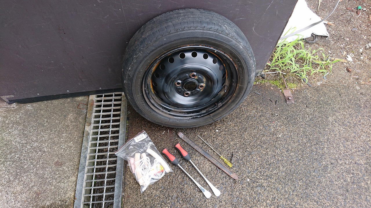 虫を取って空気を抜いたらビートを落とします、車載ジャッキの出番です、両面落としたらレバーを使ってスポンと剥いちゃいます、バイクの10インチタイヤより楽ちんです