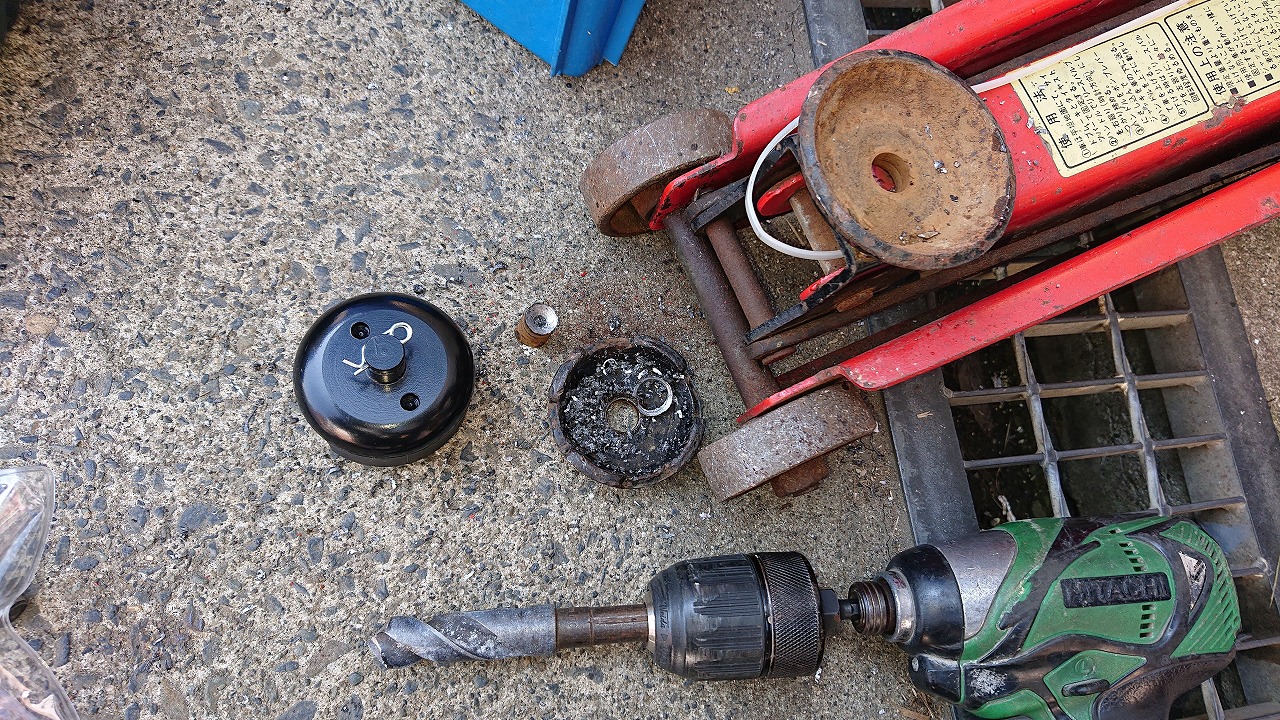 ドリルのキリでピンに穴開けしていきます、キリサイズを大きくしていき最後は13ミリで破壊しました、