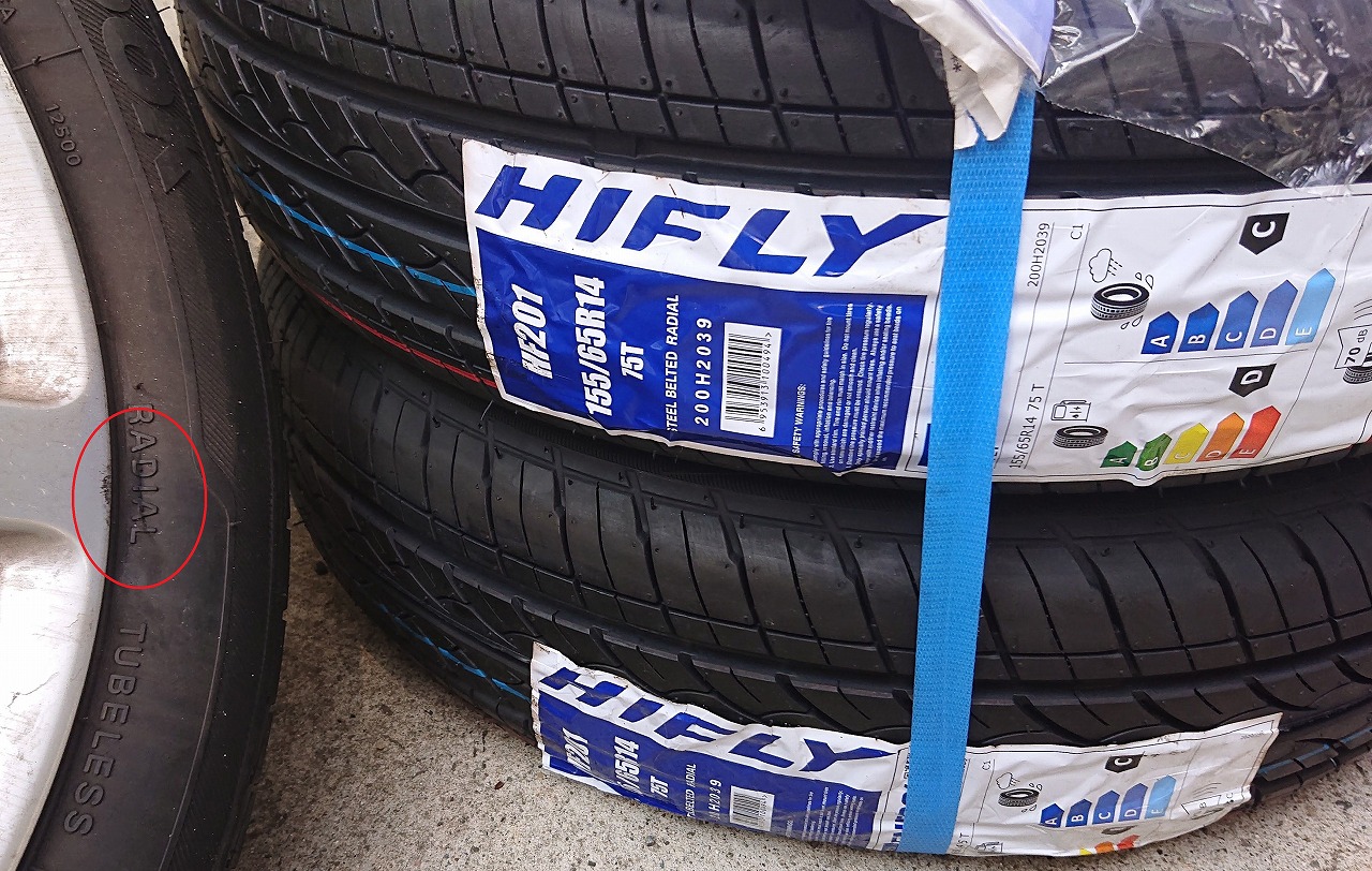 取りあえず2本交換です、タイヤパターンは左右同じですが製造日の刻印が片側しか無いようです?内側にして組み込んでしまいました