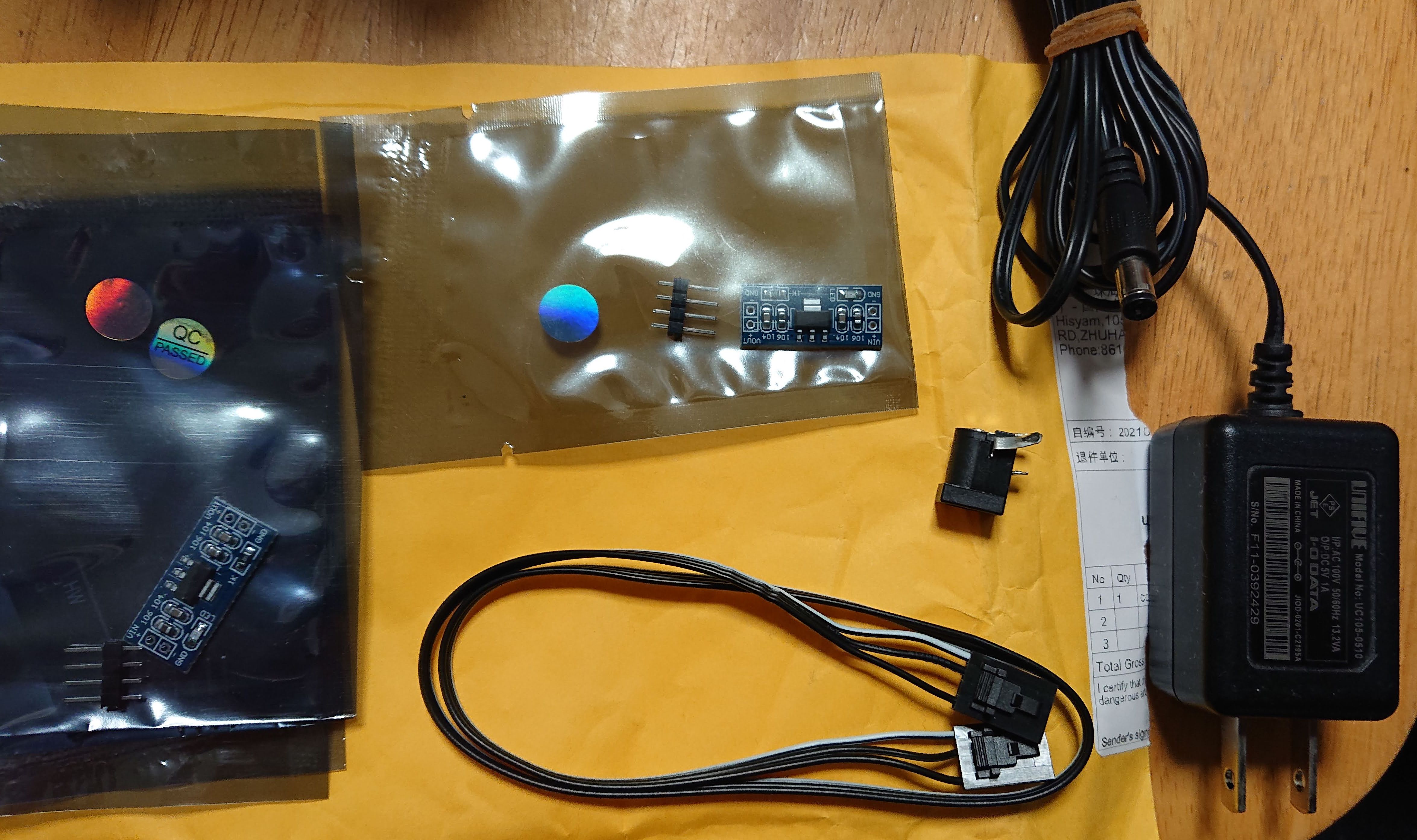 お古のアダプター、5Vの為変圧が必要です、アマゾンで変圧器をぽちっとしまして、パソコンのなんかわからんが配線も用意しました、